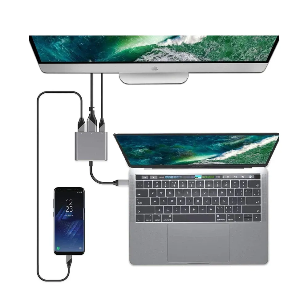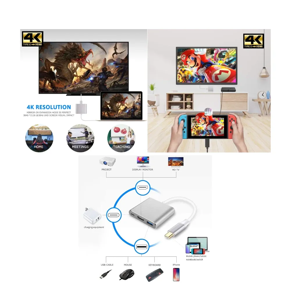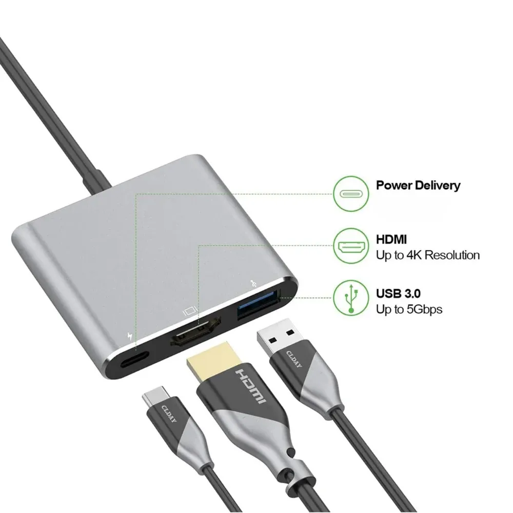 Adaptateur multiport 3-en-1 USB 3.0, HDMI 4K et Type-C vers Type-C. Compatible avec les appareils Blackview, MacBook Pro/ S8+/S9, etc.