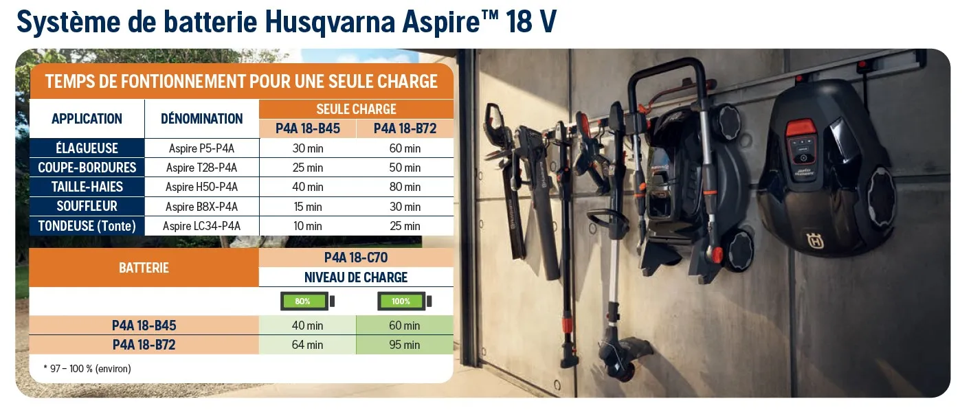 coupe-bordures à batterie HUSQVARNA ASPIRE T28-P4A livré avec batterie P4A-18-B72 et chargeur P4A-18-C70