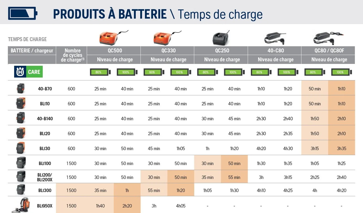 LIVRE NU – Choisir une batterie et un chargeur dans la rubrique ACCESSOIRES – compatible toutes batteries HUSQVARNA (voir tableaux en annexe)