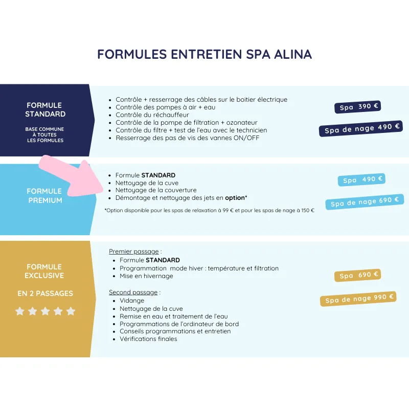Optez pour la visite de notre technicien dans le cadre d’un contrat d’entretien ! Révision complète du spa, nettoyage en option selon les formules, c’est à vous de choisir !