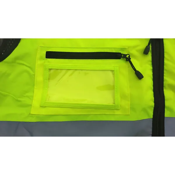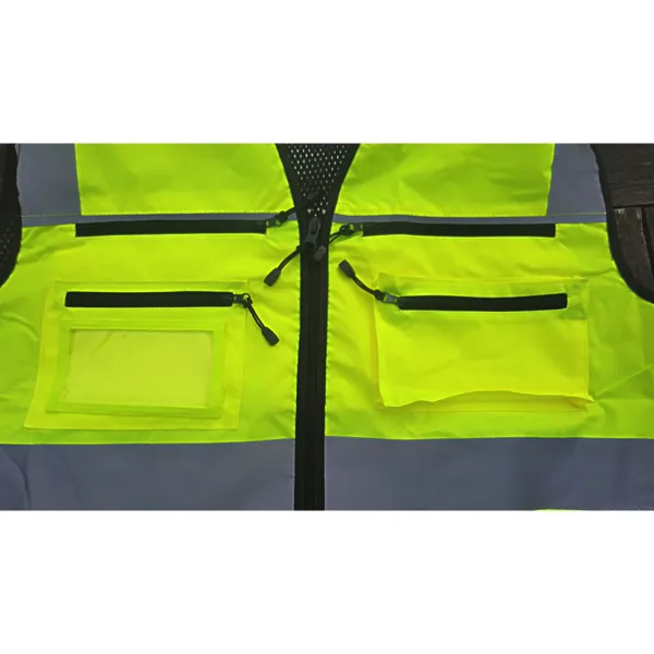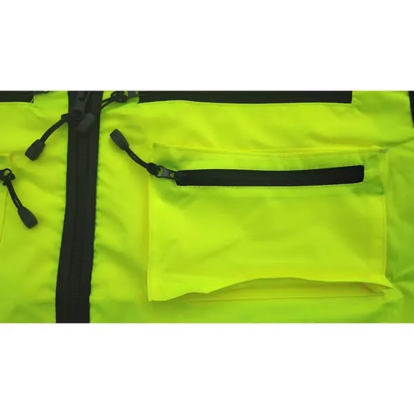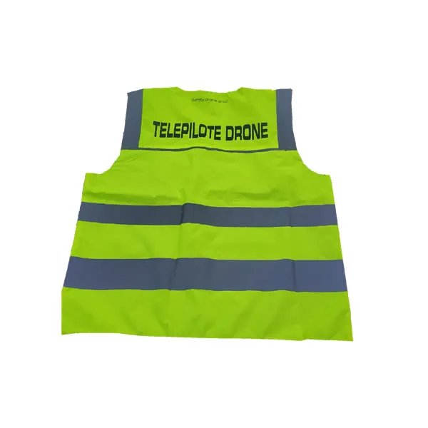 - Tous les côtés du vêtement doivent être en matière à haute visibilité pour une assurer une visibilité périphérique (360°)
