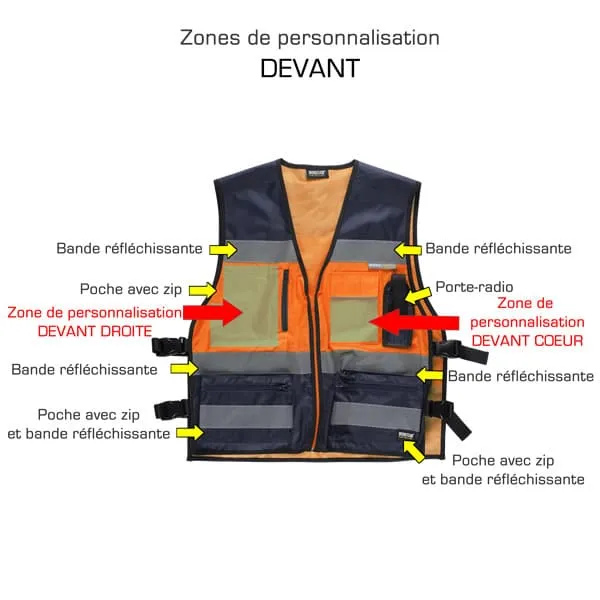 Les informations visuelles de la personnalisation peuvent être marquées sur deux parties distinctes, sur le devant du gilet: