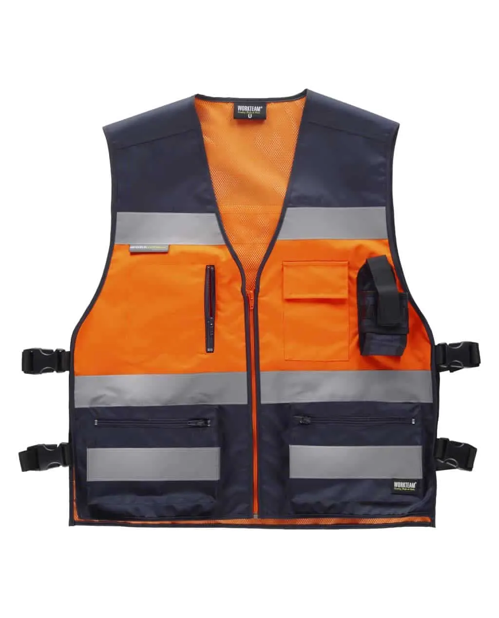 Ce gilet de travail haute visibilité en tissu Oxford (Tissu extérieur en 180 g/m2), avec réglages sur les côtés (taille unique) est proposé en couleurs bleu/orange, avec ou sans personnalisation, avec 5 zones de personnalisation proposées.