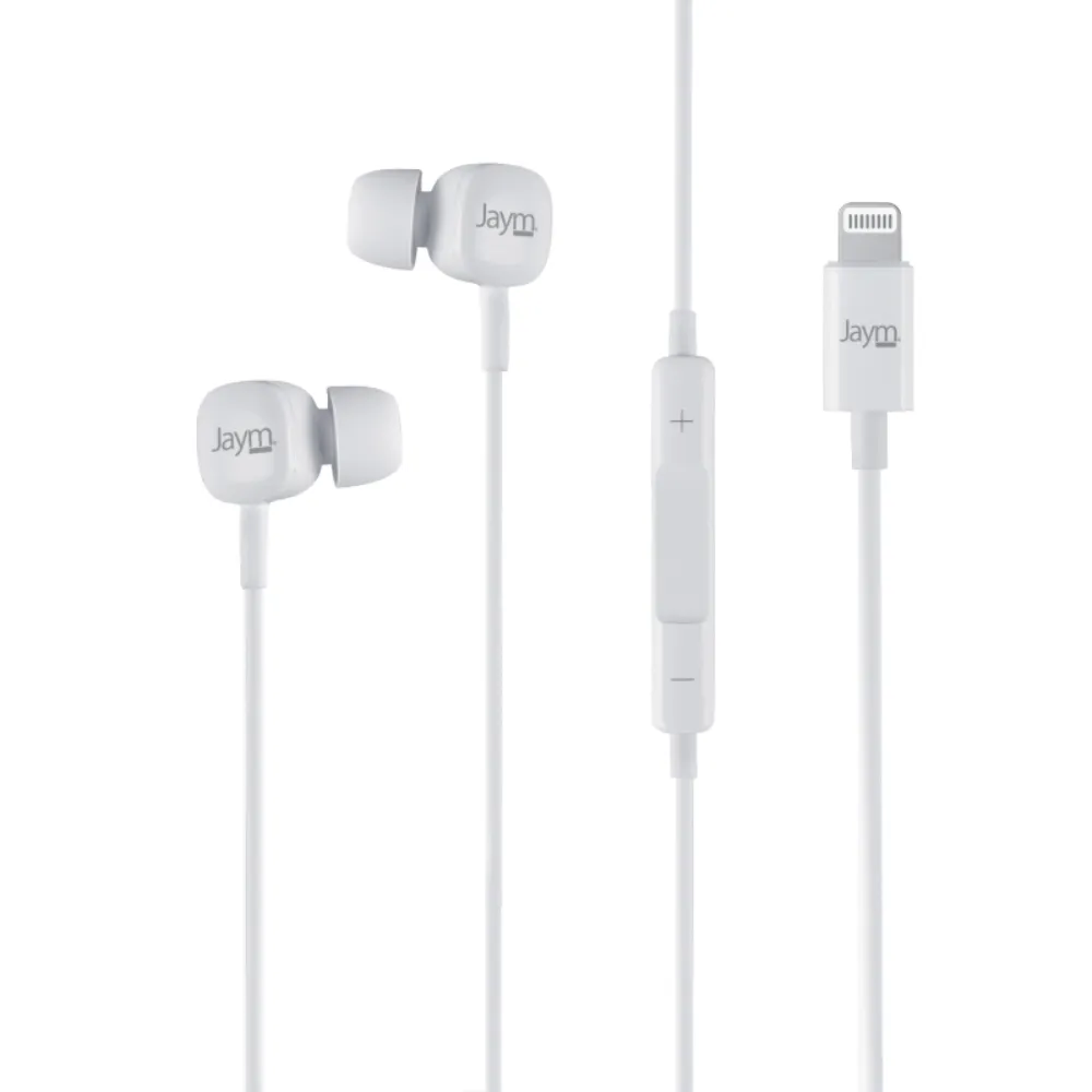 KIT PIETON ECOUTEURS INTRA-AURICULAIRE LIGHTNING (MFI) + TELECOMMANDE + MICRO BLANC – JAYM®