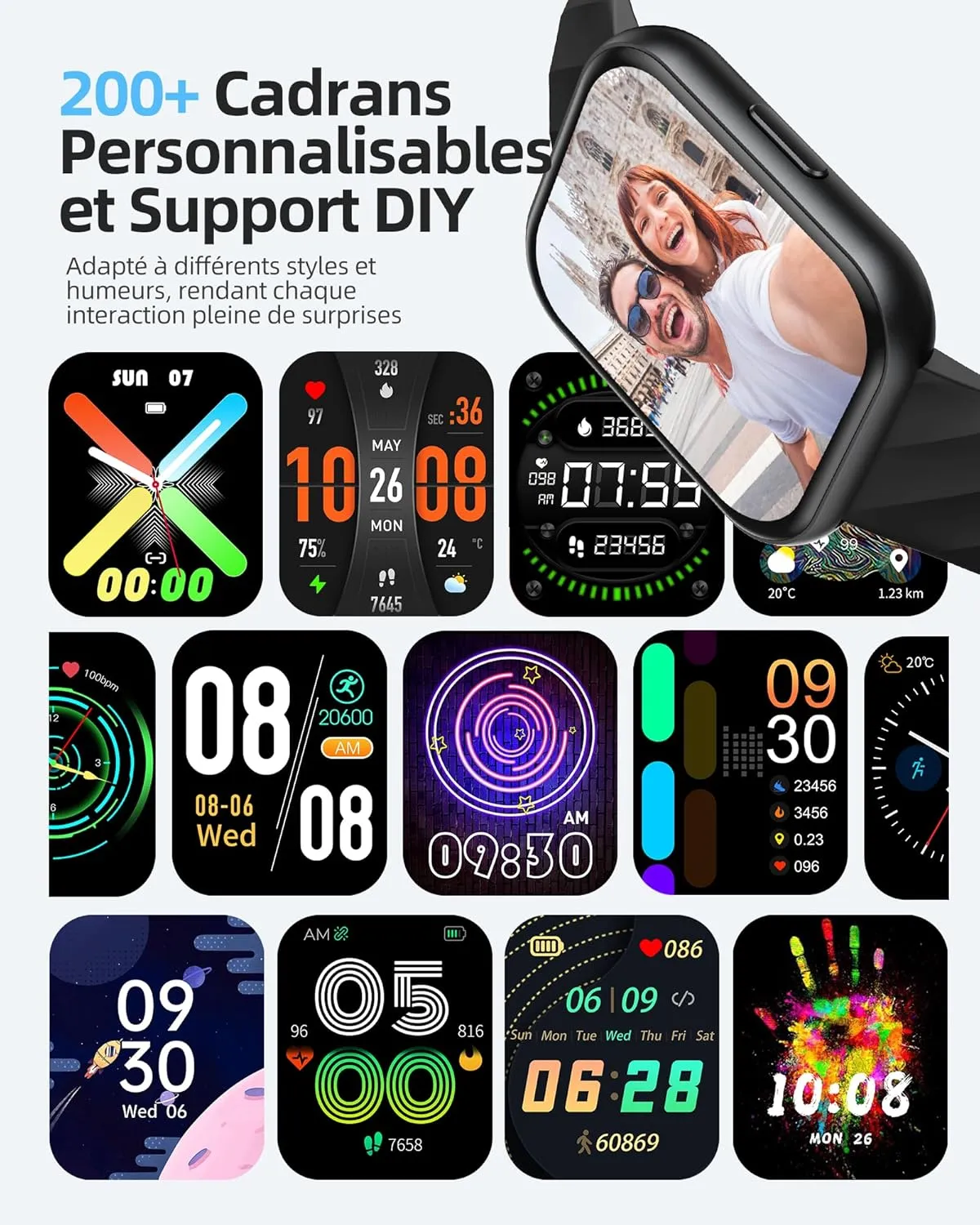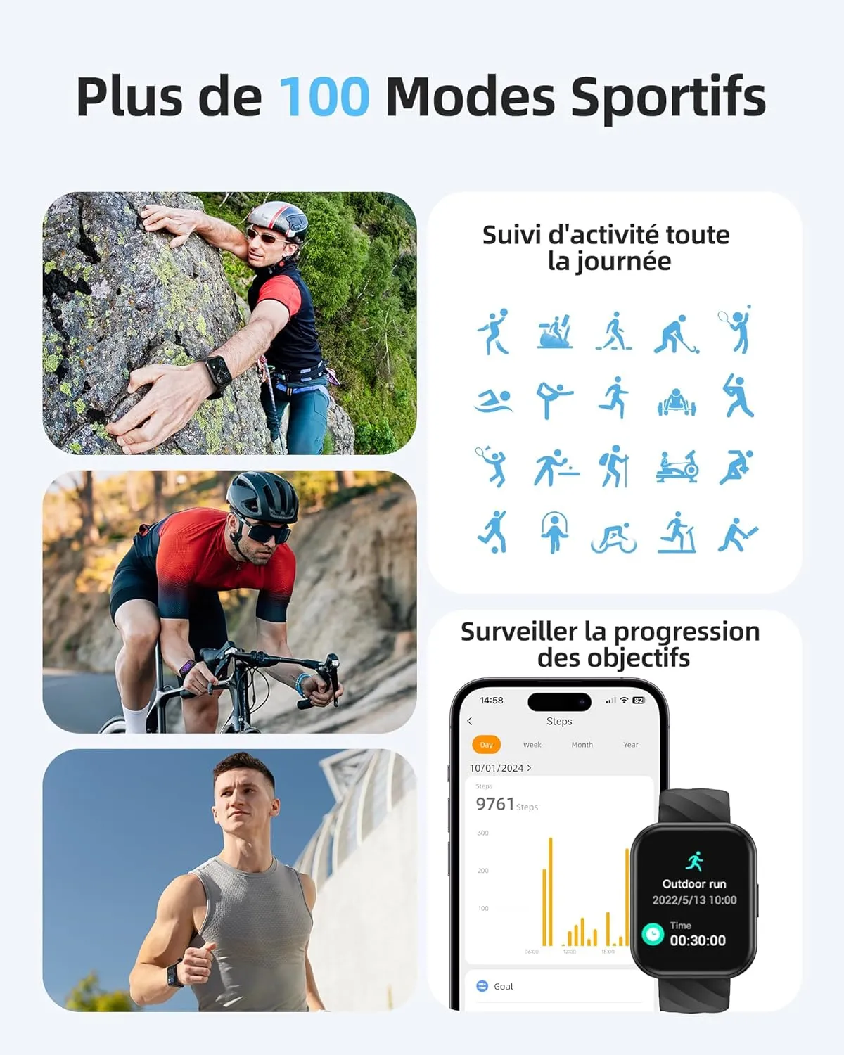 Notre montre connectée propose plus de 100 modes sportifs, vous permettant de suivre avec précision vos activités physiques, du running au vélo, en passant par la natation. Que vous soyez en pleine séance de sport ou dans une activité quotidienne, elle enregistre avec minutie votre fréquence cardiaque, vos pas, votre calorie brûlée et votre distance parcourue. Cet appareil devient votre coach personnel en vous offrant un suivi détaillé et un soutien constant pour atteindre vos objectifs de santé et de forme.