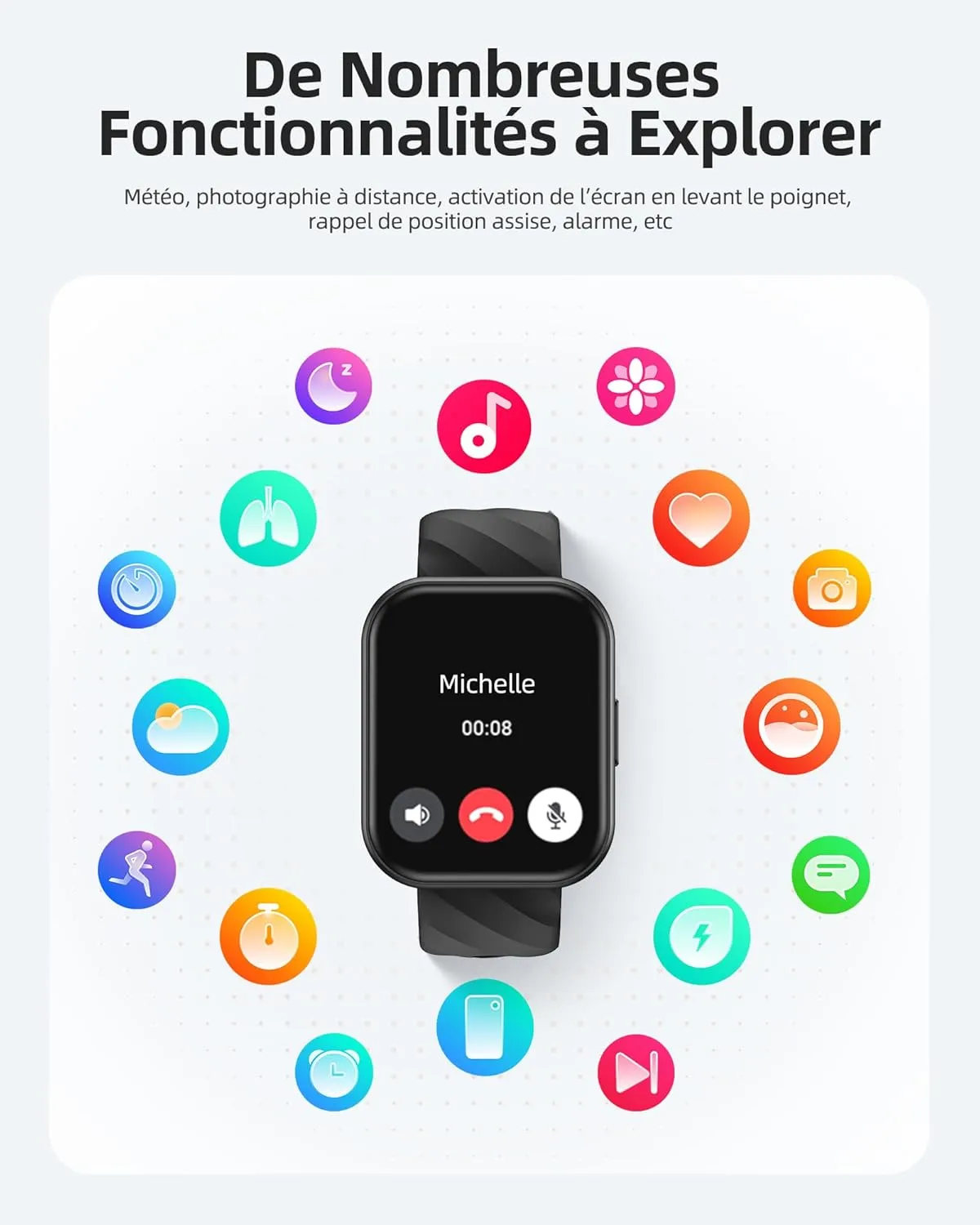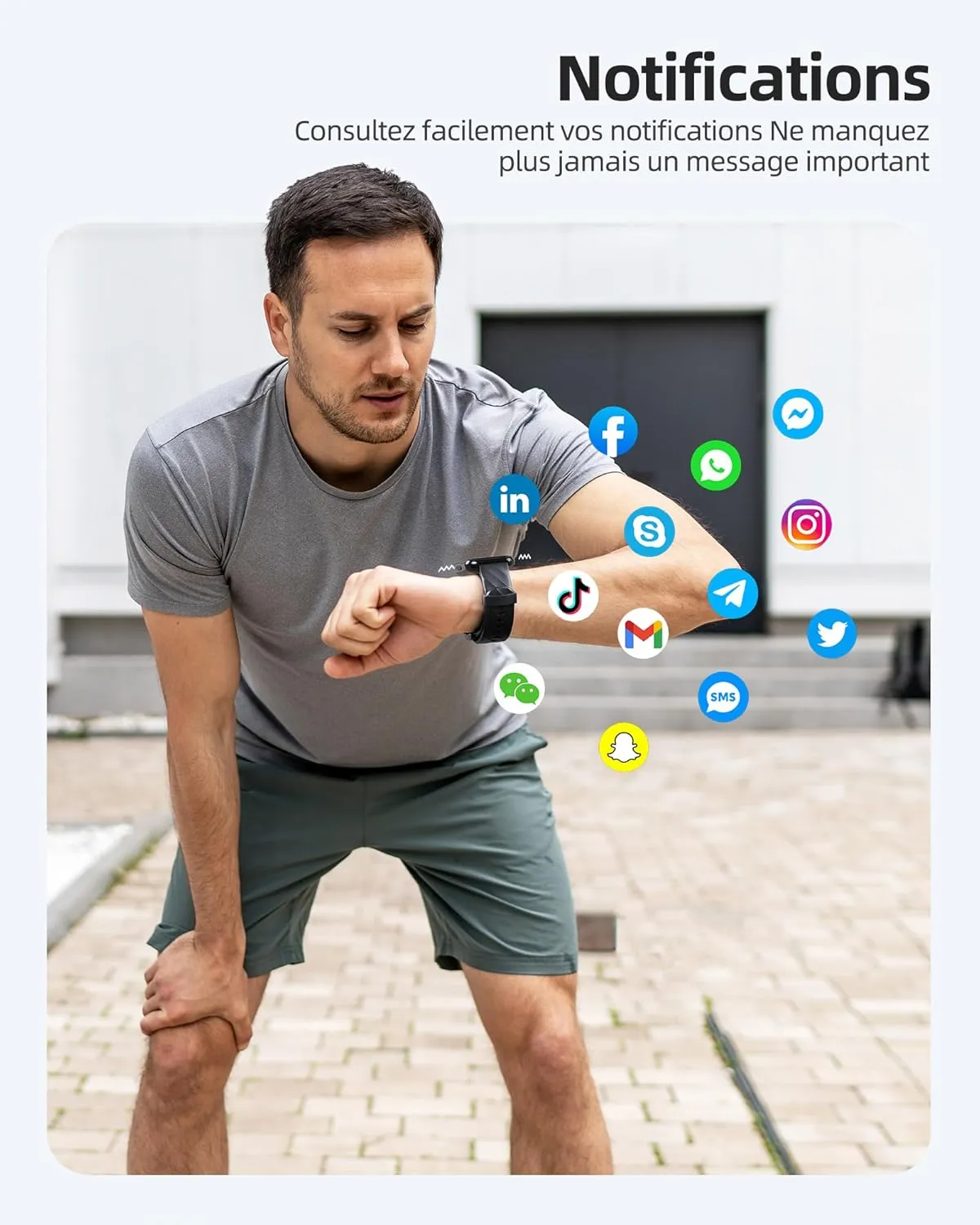 Ne ratez plus aucune notification grâce à notre montre connectée. Compatible avec Android et iOS, elle vous permet de recevoir des appels entrants, des SMS et des notifications sociales (WhatsApp, Facebook, etc.) directement au poignet. Vous pourrez consulter ces alertes et gérer vos communications sans avoir à sortir votre téléphone. Vous avez également la possibilité de refuser les appels directement depuis la montre.