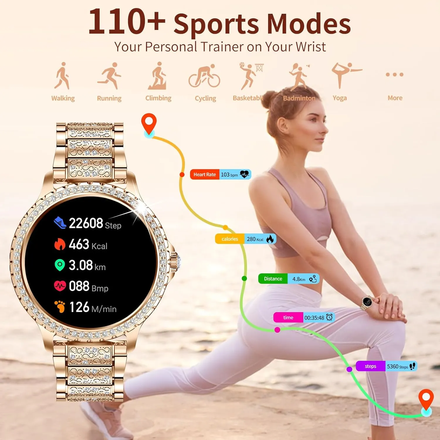 La montre connectée est ornée de 146 diamants brillants en strass, révélant un tempérament élégant, brillant et noble. Chaque détail est soigneusement travaillé pour offrir une combinaison parfaite de sport et de mode, faisant de cette montre un véritable accessoire de luxe.