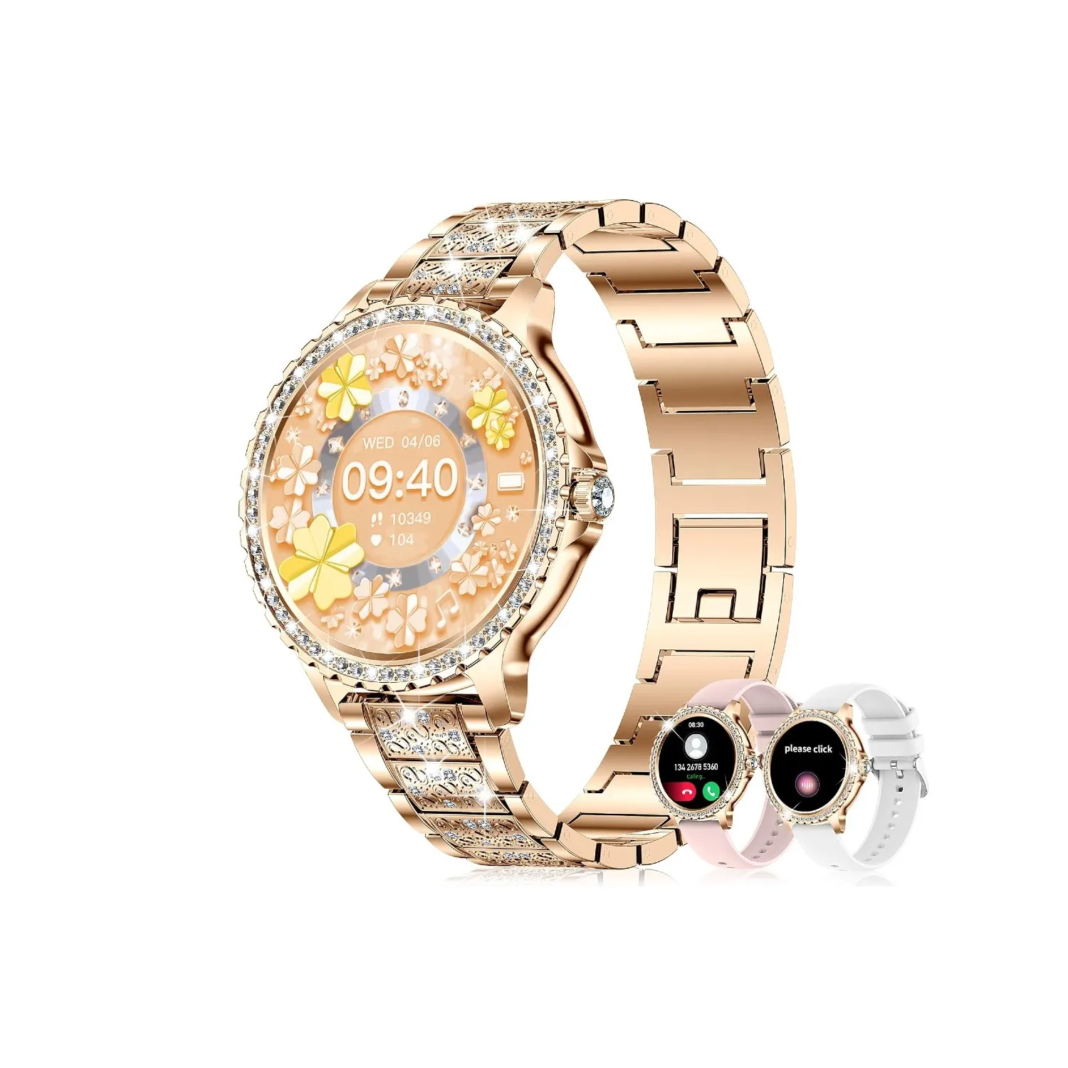 Profitez d’un écran couleur tactile de 1,32 pouce avec une résolution haute définition de 360 x 360. Personnalisez votre montre avec plus de 160 beaux arrière-plans disponibles dans l’application, ou téléchargez votre photo préférée pour un style unique. Trois bracelets interchangeables (en acier inoxydable doré/rose et en silicone blanc) sont inclus pour s’adapter à toutes les occasions.