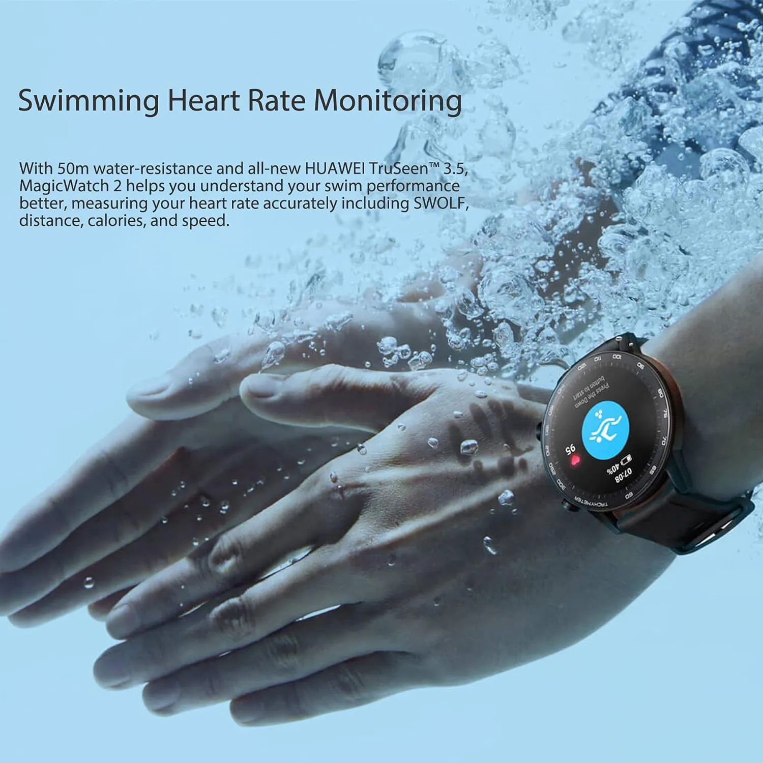 Que vous nagiez ou que vous pratiquiez des sports nautiques, notre montre résiste à une profondeur de 50 mètres. Vous pouvez ainsi surveiller vos performances en natation, y compris la distance parcourue, les calories brûlées et le SWOLF, tout en bénéficiant d’un suivi précis de votre fréquence cardiaque même sous l’eau.