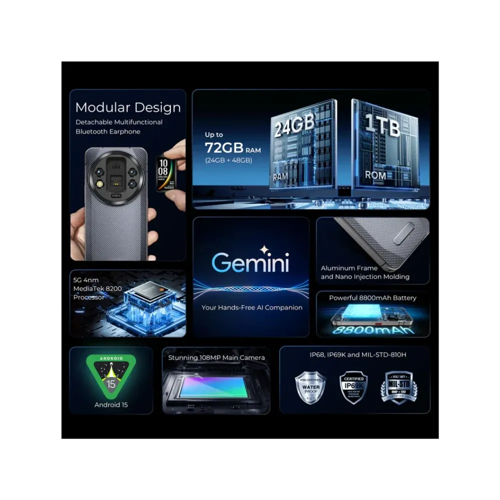 Voici le OUKITEL WP200 PRO 5G avec casque détachable et smartwatch. Il dispose d’une mémoire vive de 72 Go et d’une mémoire morte de 1 To, avec le processeur MediaTek Dimensity 8200 de dernière génération, offrant une bonne expérience de jeu et permettant de gérer plusieurs tâches en même temps et de passer d’une application à l’autre de manière transparente. En outre, il dispose d’un écran de 6,7 pouces d’une luminosité de 500 nits, d’une batterie de 8800 mAh avec charge rapide de 45 W et d’un système d’exploitation Android 15.