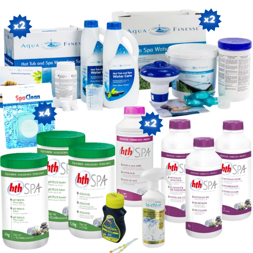 Ce pack vous assure un an d’entretien optimal, que ce soit du côté nage mais aussi relaxation, pour garder une eau belle et saine sans devoir penser à racheter régulièrement un produit par ci, par là. Le chouchou de tous, le Pack Aquafinesse spécial spa de nage mais également spécial spa, assurera une désinfection parfaite de votre eau. Vous aurez également de quoi faire pour maintenir un équilibre parfait de votre pH. Dites adieu au calcaire grâce à l’anticalcaire et bonjour à une tuyauterie impeccable avant chaque vidange grâce aux pastilles Spa Clean.