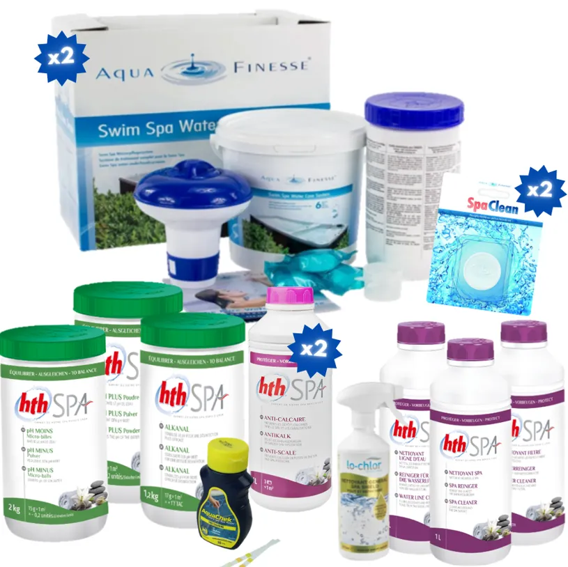 Ce pack vous assure un an d’entretien optimal, pour garder une eau belle et saine sans devoir penser à racheter régulièrement un produit par ci, par là. Le chouchou de tous, le Pack Aquafinesse spécial spa de nage, assurera une désinfection parfaite de votre eau. Vous aurez également de quoi faire pour maintenir un équilibre parfait de votre pH. Dites adieu au calcaire grâce à l’anticalcaire et bonjour à une tuyauterie impeccable avant chaque vidange grâce aux pastilles Spa Clean.