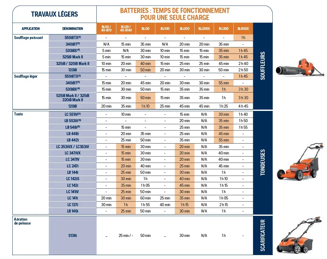 se reporter à la rubrique Autres matériels puis Batterie et Chargeur pour choisir une batterie et un chargeur adapté au produit et à votre utilisation : COMPATIBLE TOUTES BATTERIES HUSQVARNA (voir tableaux en annexe)