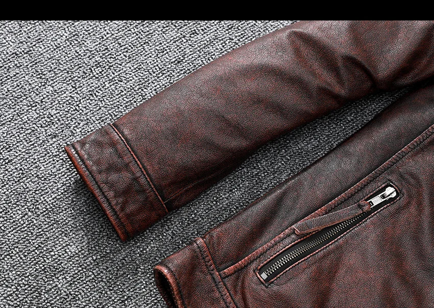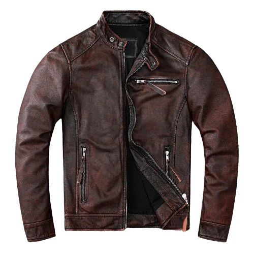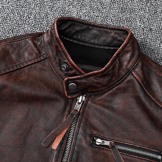 Veste biker marron en cuir de vachette vintage